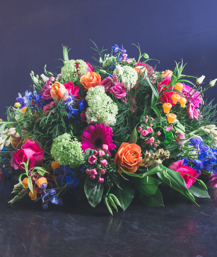 Een arrangement van verschillende kleuren en soorten bloemen. Verkrijgbaar in de maten Klein Middel en Groot. (Op de foto staat de Middel variant.)